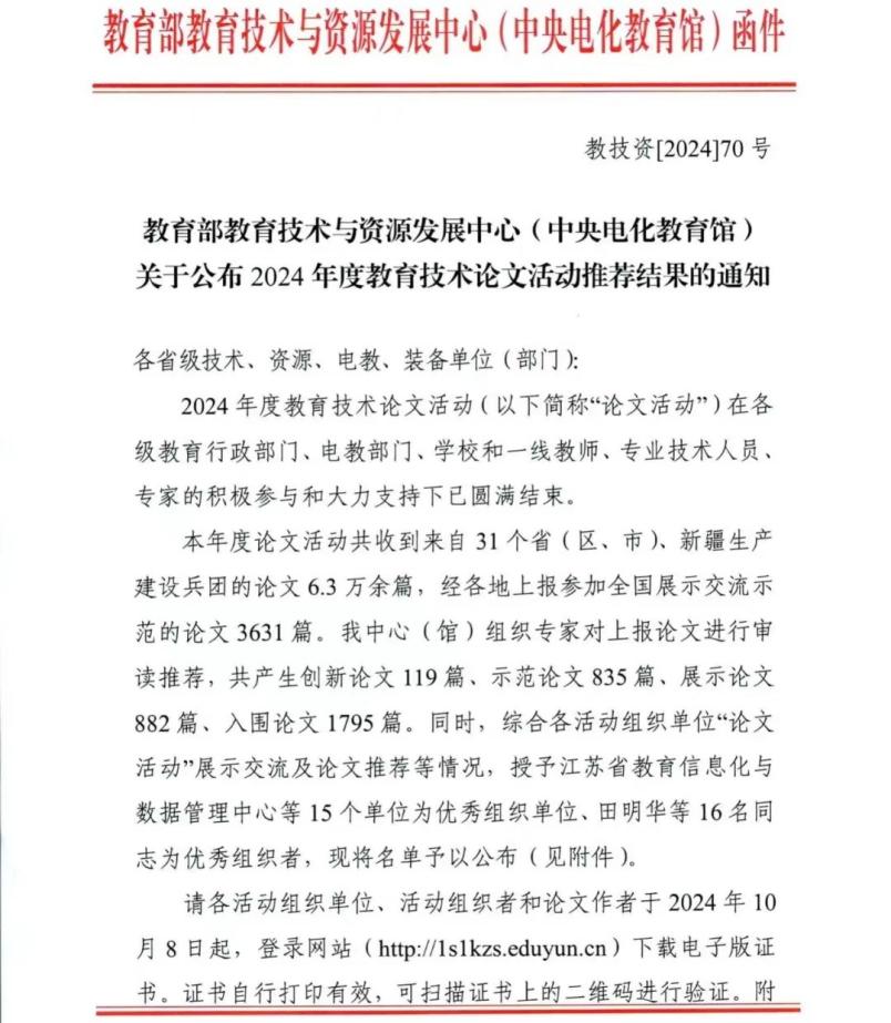 近日,教育部教育技術(shù)與資源發(fā)展中心(中央電化教育館)公布了2024年度全國教育技術(shù)論文活動推薦結(jié)果,河北省推薦參評的300篇教育技術(shù)論文全部獲獎。其中,11篇論文獲創(chuàng)新論文獎,80篇獲示范論文獎,57篇獲展示論文獎,152篇獲入圍論文獎。綜合論文獲獎數(shù)量和質(zhì)量,我省位居全國第二名。